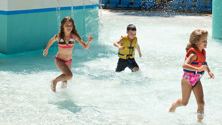 This children's play area and splash zone features a shallow heated pool, three water slides for kids and a variety of interactive water features like falls and water cannons. It's the perfect place for kids to play and practice their surfer yell. It's just the right size.