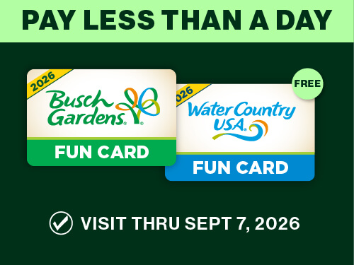 Ticket is valid for admission at Busch Gardens Williamsburg, Water Country USA & Colonial Williamsburg for up to FIVE consecutive days from date of first visit between May 9 - Sept. 20, 2026. *General parking is included at Busch Gardens & Water Country USA. Taxes and service fees not included with price. Operating days vary for each attraction, please check schedule before arrival. Park prices, products, hours and services are subject to change or cancellation without notice. Ticket may not be copied, transferred, resold or refunded and is only valid for the person listed on the ticket. Void if altered. Remains the property of SeaWorld Parks & Entertainment. Will be confiscated or revoked without restitution for misuse. Expires Sept. 20 2026.